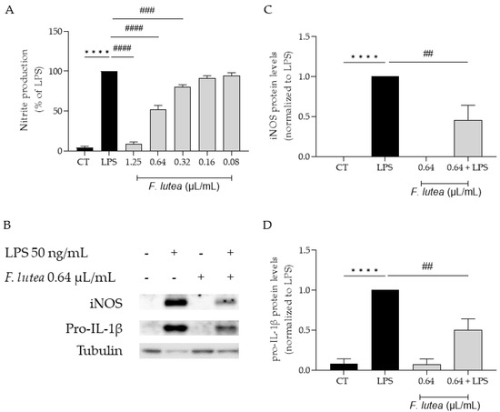 Effect of F. lutea essential oil on LPS-stimulated macrophages. (A) Nitric oxide production quantified as nitrites in the culture medium using the Griess reaction, after cell treatment with 1.25–0.08 µL/mL of the EO for 1 h followed by stimulation with 50 ng/mL of LPS for 24 h. **** p < 0.0001, when compared to control; ### p < 0.001; #### p < 0.0001, when compared to LPS, after one-way analysis of variance (ANOVA) followed by Dunnett’s multiple comparison test. (B) Representative Western blots for iNOS and pro-IL-1β. (C) iNOS protein levels. (D) Pro-IL-1β protein levels. Tubulin was used as loading control and values were normalized to LPS. Results represent mean ± SEM of at least three independent experiments. **** p < 0.0001, when compared to control; ## p < 0.01, when compared to LPS, after one-way ANOVA followed by Tukey’s multiple comparison test.