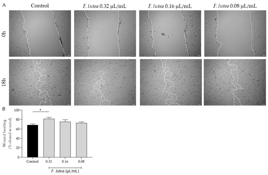 The essential oil from F. lutea promotes cell migration. (A) Representative bright-field images of NIH/3T3 fibroblasts 0 h and 18 h after scratch in the absence (control) or presence of increasing doses of the essential oil (0.32–0.08 µL/mL). (B) Percentage of closed wounds determined using an ImageJ/FIJI plugin. Results represent mean ± SEM of at least three independent assays conducted in duplicate. Scale bar: 50 µm. * p < 0.05 when compared to control after one-way ANOVA followed by Tukey’s multiple comparison test.