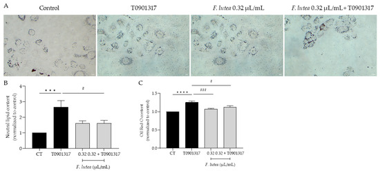 Given that, on one hand, lipogenesis decreases with age [14], and on the other hand, this process is associated with a higher incidence and more severe forms of acne vulgaris [15], our objective was to determine whether F. lutea essential oil could regulate lipogenesis in the HaCaT keratinocyte cell line. As observed in Figure 4, the presence of the essential oil affects lipogenesis differentially. Indeed, in basal conditions, the essential oil slightly stimulates lipogenesis, but not significantly. However, in the presence of T0901317, a liver X receptor (LXR) ligand known to induce lipogenesis [16], pre-treatment with the essential oil led to a significant decrease in Oil Red content as observed by microscopy analysis (Figure 4A,B) and prior to quantification (Figure 4C), indicative of lipogenesis decrease.