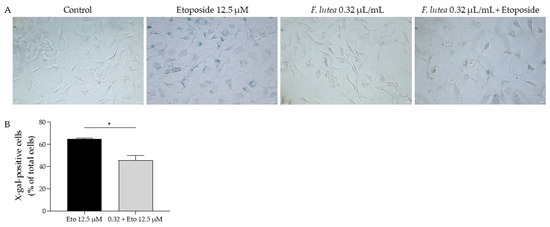 Regarding the activity of β-galactosidase, we observed that etoposide led to the activation of this enzyme, as observed in the increased amount of X-galactose (X-gal; Figure 6). However, when the essential oil was added in the recovery phase, the number of X-gal positive cells was significantly decreased, thus suggesting that F. lutea essential oil could exert anti-senescent properties.