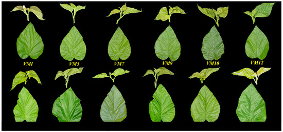 The shape and color in tender shoots and leaves of differential mulberry varieties are shown in Figure 1. As shown in Figure 1, the tender shoots’ color of most mulberry varieties is light green, and a small part of them are mauve pale (VM 1) and yellow green (VM 23). The leaves’ color of varieties can be expressed as light green (such as VM 13), green (such as VM 1), and dark green (such as VM 10), and the surfaces of leaves vary enormously between differential varieties, from relatively smooth surfaces of amorphous wax (such as VM13) to highly rough surfaces where the surface of the leaf is (such as VM 10).