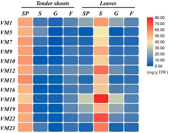 The VC content results (Figure 3b) indicated that mulberry leaves are rich in VC, and its content in tender shoots varied in the range of 129.97 to 153.68 mg/100 g of FW, and it ranged from 117.80 to 137.00 mg/100 g of FW in leaves. In addition, it clearly shows that the VC content in tender shoots was higher than that in leaves among most varieties (11/12) in the present study; only of VM 18 is VC content in tender shoots lower than that in leaves. And there were subtle differences in differential varieties with the CVs all being lower than 6% (Table S2), indicating that differences between varieties about VC content are weak.