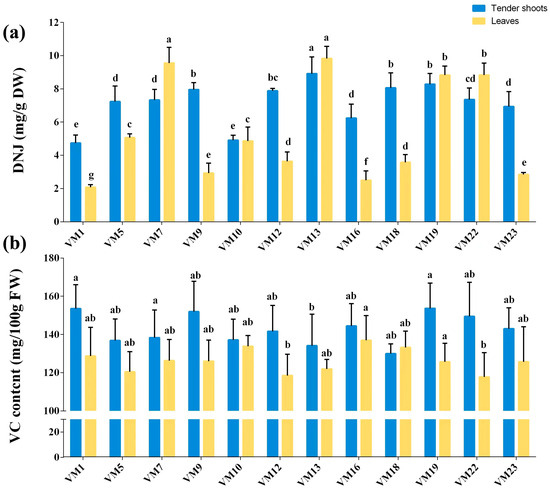 The content of DNJ and VC in tender shoots and leaves of differential mulberry varieties was tested in this study (Figure 3). The DNJ content of tender shoots and leaves also greatly varied with mulberry varieties, especially in leaves with a CV of 55.92% (Figure 3a, Table S2), and the DNJ content of the leaves of the highest-DNJ rich mulberry variety (VM 13) was nearly five times that of the mulberry variety with the lowest DNJ content (VM 1). Of differential mulberry varieties, DNJ content of tender shoots ranged from 4.92 to 8.92 mg/g of DW, and that of leaves varied greatly in the range of 2.08 to 9.84 mg/g of DW among varieties (Table S2), and the DNJ content of most varieties in tender shoots (10/12) rose to 6 mg/g of DW; however, there are only four varieties with more than a 6 mg/g of DW DNJ content. Notably, our analysis identified VM7, VM13, and VM19 as major DNJ accumulators, thereby showing that those varieties can be recommended for consumption or as breeding partners to increase DNJ levels in mulberry.