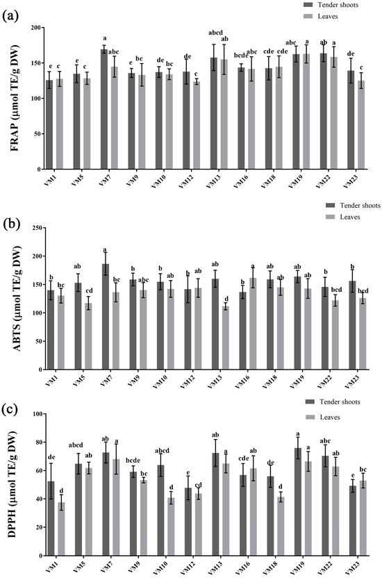 The total antioxidant activities of tender shoots and leaves in differential mulberry varieties. (a) FRAP values; (b) ABTS radical scavenging activities; (c) DPPH radical scavenging activities. The data are mean values of three replicates and standard deviation of the mean, and the different small letter superscripts within the same group (tender shoots or leaves) of histograms represent significant differences at p < 0.05 (ANOVA and LSD test).