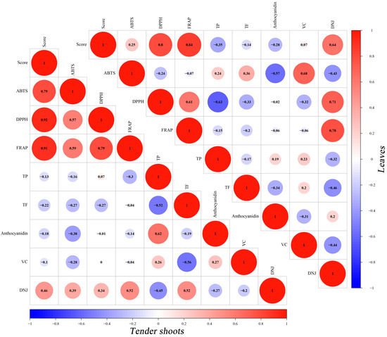It can be seen that the comprehensive evaluation score of antioxidant activities is significantly positively correlated with ABTS radical scavenging activities, DPPH radical scavenging activities, and FRAP values of tender shoots (R = 0.78, 0.92, 0.91; p < 0.05) from the PCC analysis results shown in Figure 4. The results show that the FARP values, and DPPH radical scavenging activities, have a significant relation with the overall score of antioxidant activity of leaves, with the R score of 0.8 (p < 0.01) and 0.84 (p < 0.01), respectively, while there is a lower relation between the ABTS radical scavenging activities and the comprehensive evaluation score of total antioxidant activities (R = 0.25, p < 0.05) (Figure 5). From Figure 5, ‘DNJ content’ was found to have the highest positive relation with the comprehensive evaluation score compared to other compound indexes (R = 0.46, 0.64), exhibiting close association with the total antioxidant activities of tender shoots or leaves. Especially DNJ content in leaves show a significant positive relation with the comprehensive evaluation score of total antioxidant activities (p < 0.01).