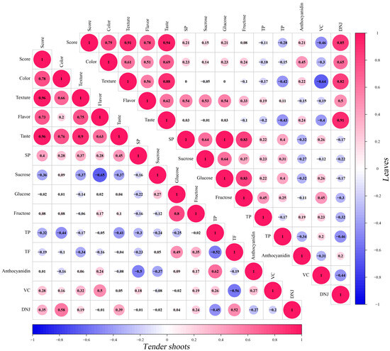 According to the profile and content of carbohydrates, SP content, polyphenolic compounds, DNJ, and VC in tender shoots or leaves of mulberry, we further studied the relationship between sensory quality character indexes and the content of carbohydrates, SP, polyphenolic compounds, DNJ, and VC, and PCC results are shown in Figure 6. It is clearly shown that comprehensive evaluation sensory quality character indexes of tender shoots or leaves were all stronger related to texture and taste, and the correlation coefficients were all exceeding 0.9 (R of tender shoots = 0.96, 0.96 (p < 0.01); R of leaves = 0.91, 0.94 (p < 0.01)), indicating that texture and taste were two important quality characteristics and major factors affecting sensory perception and consumer acceptance of mulberry vegetables. Additionally, the correlation coefficients of the comprehensive evaluation score and color or flavor were all higher than 0.7 but lower than 0.8 (R tender shoots = 0.78, 0.73 (p < 0.01); R of leaves = 0.79, 0.78 (p < 0.01)), and were less than texture and taste.