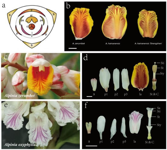 Zingiberales constitute a monophyletic order with two main groups: the “ginger group”, which encompasses Marantaceae, Cannaceae, Zingiberaceae, and Costaceae, and the “banana group”, which includes Strelitziaceae, Musaceae, Lowiaceae, and Heliconiaceae [1,2,3]. Within the ginger group, all four subgroups share a characteristic feature where petaloid staminodes replace the majority stamens in mature flowers [4,5]. Alpinia, a genus belonging to the Zingiberaceae family, stands out as a group of plants with substantial ornamental and medicinal significance. The flowers of this genus consist of four distinct floral whorls (Figure 1a): the outer perianth comprises three sepals, followed by three petals forming the inner perianth. The androecial whorl consists of one fertile stamen and five staminodes, with two of these typically fusing to develop a particular abaxial labellum. Another two adaxial staminodes degenerate into diamond-shaped appendages, persistent at the base of the labellum. The last abaxial staminode degenerates and disappears. The innermost whorl features a tricarpellary pistil. In most flowering species, stamens primarily serve reproductive functions and do not contribute to the visual appeal of the flower. Alpinia, however, presents an exception, as the perianth is inconspicuous in mature flowers and constitutes only some components of the floral display. Instead, the labellum that is formed by the fusion of two petaloid staminodes occupies a position homologous to stamens but exhibits properties more akin to perianth than androecium.