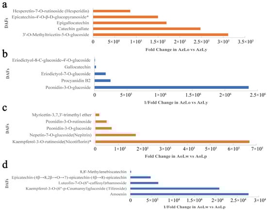 The top five upregulated and downregulated DAFs based on the fold change value. (a) The top five upregulated DAFs in AzLo vs. AzLy. (b) The top five downregulated DAFs in AzLo vs. AzLy. (c) The top five upregulated DAFs in AoLw vs. AoLp. (d) The top five downregulated DAFs in AoLw vs. AoLp. The asterisk in the upper right corner of the compound indicates that the compound was detected to have isomers.