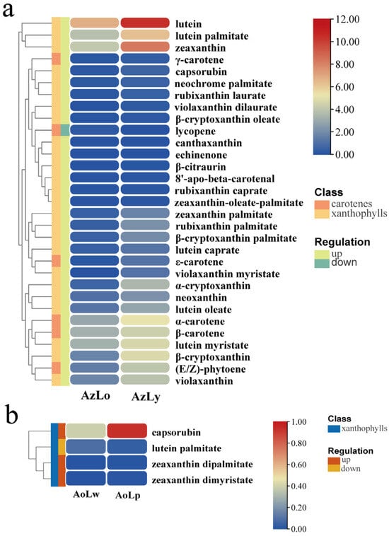 Thirty-one differentially accumulated carotenoids (DACs) were found in AzLo vs. AzLy based on the identification criterion of |log2FoldChange| ≥ 2 or ≤ 0.5, of which one metabolite was downregulated, while 30 metabolites were upregulated (Figure 4a). Zeaxanthin, α-cryptoxanthin and lutein were the most significantly elevated metabolites, while lycopene was the only reduced metabolite (Figure 4a). It should be noted that violaxanthin dilaurate, violaxanthin myristate and β-citraurin were only identified in AzLy and the content of these three compounds were extremely low. In AoLw vs. AoLp, only four carotenoid metabolites were identified to be significantly different, including one downregulated metabolite (lutein palmitate) and three upregulated carotenoid metabolites (zeaxanthin dipalmitate, capsorubin and zeaxanthin dimyristate) (Figure 4b). The contents of these four DACs were less than 1 μg/g. The absence of significant carotenoid content in these segments suggests that other pigments may be responsible for their coloration.