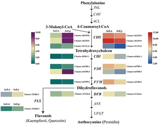 Transcriptomic analyses comparing gene expression profiles between AzLo vs. AzLy and AoLw vs. AoLp to pinpoint key DEGs in differently colored segments of Alpinia labellum detected 12,840 DEGs meeting the criteria of a two-fold alteration at p < 0.05. Specifically, there were 5486 DEGs in the AzLo vs. AzLy comparison, comprising 2917 upregulated and 2569 downregulated genes (Figure S2a). The biological process included 51 flavonoid biosynthetic processes and 51 carotenoid biosynthetic processes (Figure S2b). A total of 7354 DEGs were identified in the AoLw vs. AoLp group, encompassing 3318 upregulated and 4036 downregulated genes (Figure S2c). The top 50 enriched GO pathways are displayed in Figure S2d. Comparing the results of KEGG enrichment analyses of DAFs and DEGs revealed six pathways that were enriched in both flavonoid metabolome and transcriptome. In the AzLo vs. AzLy group, these included metabolic pathways (7 metabolites, 1150 genes), biosynthesis of secondary metabolites (11 metabolites, 687 genes), flavonoid biosynthesis (11 metabolites, 36 genes), isoflavonoid biosynthesis (1 metabolite, 15 genes), flavone and flavonol biosynthesis (11 metabolites, 9 genes), and anthocyanin biosynthesis (1 metabolite, 1 gene). In the AoLw vs. AoLp group, metabolic pathways (10 metabolites, 1150 genes) and biosynthesis of secondary metabolites (14 metabolites, 642 genes) were the most enriched, followed by flavonoid biosynthesis (14 metabolites, 24 genes), isoflavonoid biosynthesis (1 metabolite, 8 genes), anthocyanin biosynthesis (1 metabolite, 3 genes), and flavone and flavonol biosynthesis (12 metabolites, 3 genes). Based on the joint analysis of the carotenoid metabolome and transcriptome data, four KEGG pathways that were enriched in both metabolome and transcriptome were identified. In AzLo vs. AzLy, these pathways were metabolic pathways (11 metabolites, 1150 genes), biosynthesis of secondary metabolites (14 metabolites, 687 genes), biosynthesis of cofactors (2 metabolites, 122 genes), and carotenoid biosynthesis (15 metabolite, 53 gene). In AoLw vs. AoLp, only carotenoid biosynthesis was shared (1 metabolites, 15 genes). These pathways and genes enriched by both the metabolome and transcriptome provide us with directions for screening potential genes involved in flavonoid and carotenoid biosynthesis.
