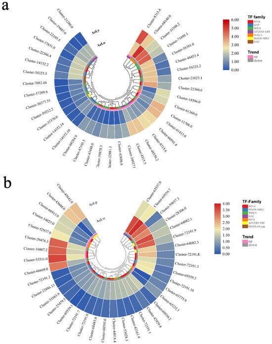 The expression pattern of differentially expressed transcription factors linked to flavonoid and carotenoid metabolite biosynthesis. TFs with an |log2FoldChange| > 2.0 were grouped based on a color-scaled log-transformed RPKM value. The color bars in the innermost circle indicate various TF families with corresponding colors representing their family identity (legend on the right). Pink and gray bars depict up and downregulated TFs, respectively. (a,b) show the expression pattern of differentially expressed TFs in AzLo (inner whorl) vs. AzLy (outer whorl) and in AoLw (inner whorl) vs. AoLp (outer whorl), respectively.