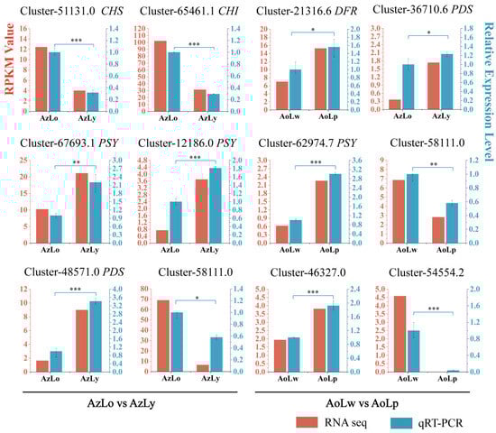 Twelve unigenes were chosen to confirm the precision and reproducibility of the transcriptome analyses using qRT-PCR. Among them, eight unigenes were related to flavonoid and carotenoid biosynthetic pathways, and four were chosen for comparison. qRT-PCR analysis of their expression patterns was generally in line with their RPKM values from transcriptome analysis (Figure 7). In A. zerumbet, the expressions of CHS (Cluster-51131.0) and CHI (Cluster-65461.1) putative genes showed higher expression in AzLo than that in AzLy, while two PSYs (Cluster-67693.1 and Cluster-12186.0) and PDS (Cluster-48571.0) were significantly upregulated in the yellow segment (AzLy). In A. oxyphylla, the expression of DFR (Cluster-21316.6), PDS (Cluster-36710.6) and PSY (Cluster-62974.7) displayed a significant increase in AoLw vs. AoLp.