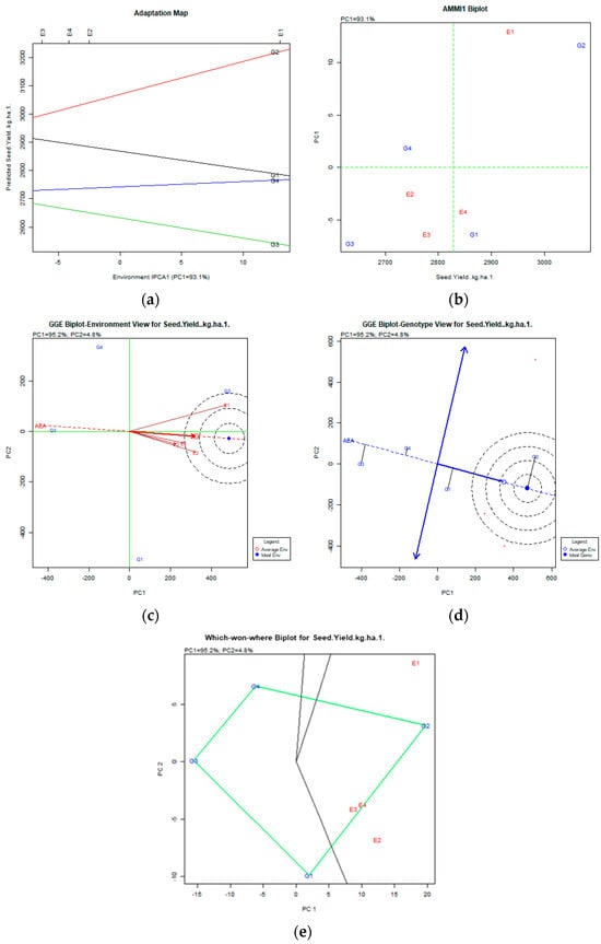 Seed yield (kg ha−1) stability analysis based on (a) AMMI adaptation map, (b) AMMI1 biplot, (c) environmental stability GGE biplot, and (d) genotypic stability GGE biplot. The genotypes closer to the ideal genotype are more desirable. (e) Which-won-where GGE biplot for specific adaptability of genotypes over environments.