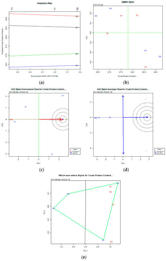 Crude protein content stability analysis based on (a) AMMI adaptation map, (b) AMMI1 biplot, (c) environmental stability GGE biplot, and (d) genotypic stability GGE biplot. The genotypes closer to the ideal genotype are more desirable. (e) Which-won-where GGE biplot for specific adaptability of genotypes over environments.