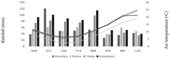 Four separate locations, two in Northern Greece and two in Central Greece, were utilized for the field trials. These locations varied in terms of the soil type, altitude, and environmental variables (Table 7 and Figure 3).