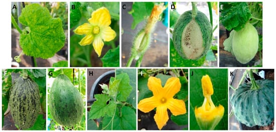 Symptom development of ToLCNDV in vegetative and reproductive organs of C. melo and C. moschata plants: (A) melon leaf infected with ToLCNDV displaying severe mosaic and mild curling. (B,C) male and female flowers of C. melo-infected plants with deformed petals and cracked ovary. (D) immature melon fruit aborted as consequence of ToLCNDV infection. (E–G) melon fruits with skin roughness in ToLCNDV-infected plants that arrived at a ripening stage and produced viable seeds. (H–K) leaves, flowers and fruit of asymptomatic C. moschata plants.