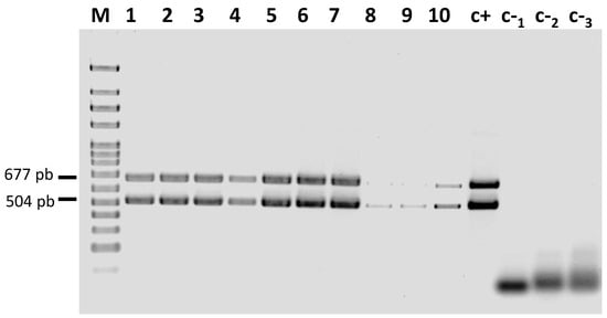 Detection of ToLCNDV-A- and -B-specific fragments by conventional PCR in symptomatic leaves of plants infected by whitefly transmission 21 days after vector and source of inoculum (MU-CU-16 zucchini plants) establishment. Lanes 1 to 5: C. melo inodorus group samples, lane 6: C. melo cantalupensis group sample, lane 7: C. melo flexuous group sample, lane 8: C. moschata Nigerian Local genotype, lanes 9 and 10: Nigerian Local derived breeding lines, c+: positive control, c-1 and c-2: healthy plants used as negative controls, c-3: water negative control, M: molecular weight marker DNA Ladder (NZYDNA Ladder VII, ranging from 100 to 3000 bp, NZYTECH, Lisbon, Portugal).