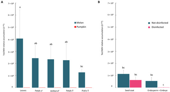 ToLCNDV relative accumulation (2−ΔCt) quantified by qPCR on leaf tissue, petals and reproductive organs of male (♂) and female (♀) flowers of infected plants at the greenhouse of COMAV-UPV (A) and in different parts of seeds obtained by their self-pollination with or without bleach treatment (B). Error bars represent the standard errors of the means. Bars with the same lowercase letters show not significantly different means at p ≤ 0.05.
