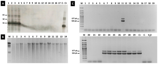 Analysis of ToLCNDV replication in seedlings of the progeny: (A) Southern blot analysis. Detection of open circular dsDNA (OC), supercoiled dsDNA (SC) and ssDNA (SS) forms of ToLCNDV in leaves (lane 1), flower tissues (lanes 2 and 3) and whole seeds (lane 4) of melon plants cultivated at COMAV-UPV; none of the forms were detected in seedlings of the offspring (lanes 5 to 17); C−: DNA of a healthy melon plant was used as a negative control; C+: DNA of a MU-CU-16 agro-infiltrated plant was used as a positive control. (B) RCA products obtained from DNA extracts of positive-for-ToLCNDV seedlings of the different offsprings evaluated (lanes 1 to 7) and tissues of parental plants inoculated with the virus (lanes 8 to 14). M: molecular weight marker DNA (Lambda DNA/HindIII Marker, ranging from 564 to 23,130 pb, ThermoFisher Scientific, Waltham, MA, USA). (C) PCR products amplified from DNA samples subjected to RCA of positive-for-ToLCNDV seedlings of the different melon offsprings evaluated (lanes 1 to 10 and 12 to 22), seed endosperm + embryo disinfected with bleach (lane 11), whole melon seed (lane 23), reproductive organs of melon flowers (lanes 24 to 27) and leaves (lanes 28 and 29) infected with ToLCNDV; C+: DNA (not subjected to RCA) of a MU-CU-16 agro-infiltrated plant was used as a positive control; C−: DNA (not subjected to RCA) of a healthy melon plant was used as a negative control; H2O: water was used as negative control for PCR. M: molecular weight marker DNA Ladder (NZYDNA Ladder VII, ranging from 100 to 3000 bp, NZYTECH, Lisbon, Portugal).