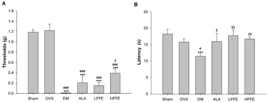 Mechanical paw withdrawal thresholds in response to stimulation with flexible von Frey filaments (A) and paw withdrawal latencies in response to thermal noxious stimuli (B) of high-fat diet/streptozotocin (HFD/STZ)-induced ovariectomized diabetic mice fed with Ficus formosana extract (FFE) for 6 weeks. Abbreviations are the same as those in Table 1. Each value is the mean ± SEM. *** p < 0.001 vs. sham group; # p < 0.05, ### p < 0.001 vs. OVX group; $ p < 0.05, $$ p < 0.01 vs. DM group. N = 6 for each group.