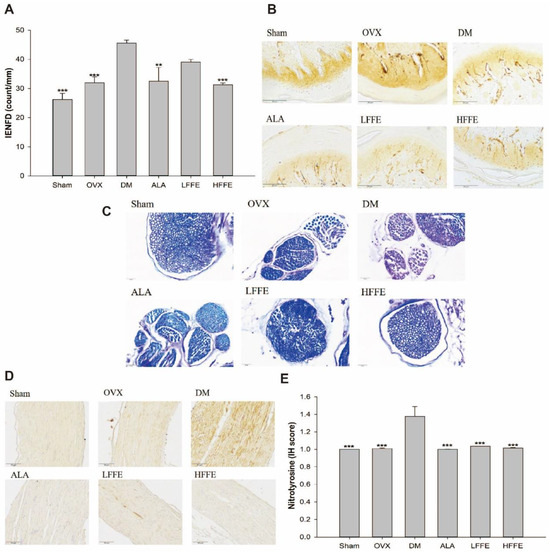 Intraepidermal nerve fiber density (A) and profiles (200×) (B) in the paw skin, myelin sheath biopsy of the sciatic nerve with Luxal fast blue stain (400×) (C), immunohistochemistry of nitrotyrosine in the sciatic nerves (200×) (D), and quantification (E) of HFD/STZ-induced ovariectomized diabetic mice fed with FFE for 6 weeks. Abbreviations are the same as those in Table 1. Each value is the mean ± SEM. ** p < 0.01, *** p < 0.001 vs. DM group. N = 6 for each group.