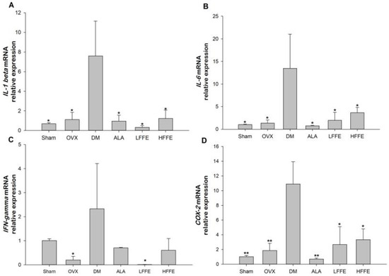 The interleukin (IL)-1β mRNA expression in the DM group was significantly increased compared with that in the sham and OVX groups (p < 0.05) (Figure 3A). LFFE and HFFE treatments significantly reduced IL-1β mRNA expression in the diabetic mice (Figure 3A). Furthermore, the DM group had enhanced IL-6 mRNA expression; however, it was significantly decreased by LFFE and HFFE treatments (Figure 3B). The interferon (IFN)-γ mRNA expression in the DM group was increased compared with that in the OVX group (p < 0.05) (Figure 3C). However, the LFFE treatment significantly reduced the IFN-γ mRNA expression in the diabetic mice (Figure 3C). Moreover, the DM group had significantly higher cyclooxygenase (COX)-2 mRNA expression than the OVX group (p < 0.05); however, both HFFE and LFFE treatments significantly decreased the COX-2 mRNA level in the diabetic mice (Figure 3D).