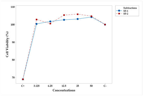 The cytotoxicity of fractions F-1 and F-2 at concentrations of 3.125, 6.25, 12.5, 25, and 50 μg/m was assessed for their effect on viability in murine RAW 264.7 macrophage cells. Lipopolysaccharides (LPS) and lipopolysaccharides + indomethacin (LPS + Indo) were used as negative (C−) and positive (C+) controls, respectively. The corresponding analysis of variance (Table 1) showed that concentration was the only significant factor, and all concentration levels were equal and significantly different from the negative control (Table 2); hence, both fractions did not show cell cytotoxicity at the concentrations used in the experiment (Figure 2).