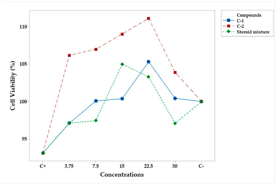 The analysis of variance showed that the compounds (campesteryl palmitate, C-1, n-heptyl ferulate, C-2, and the steroid mixture) and concentration were statistically significant (Table 5). Tukey’s test found C-2 to be different from C-1 and the mixture (Table 6). Neither concentration resulted in cell cytotoxic compared to the negative control (C−) (Table 7). Figure 4 shows profiles for the two compounds and the mixture with respect to concentration and confirms the above interpretation. The results showed no macrophage toxicity of compounds or the mixture at any of the studied concentrations.
