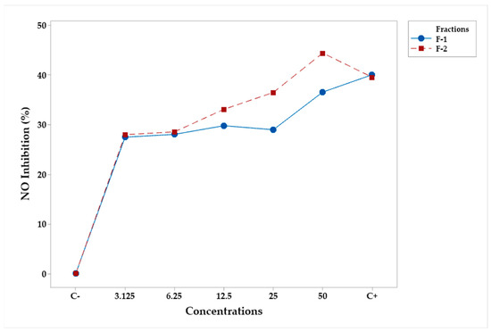 The inhibition of NO from fractions F-1 and F-2 was studied at concentrations of 3.125, 6.25, 12.5, 25, and 50 μg/mL. The analysis of variance (Table 8) shows that concentration was the only significant factor (p-value < 0.05). Tukey’s test showed that none of the concentrations were statistically different of C+, and all were better than C− (Table 9). Figure 5 shows that only F-2 at a concentration of 50 μg/mL was better than C+.