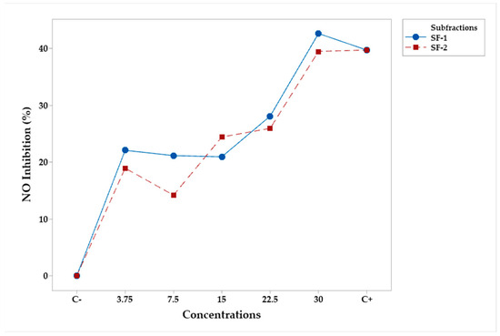 The effects of subfractions and their concentrations on NO inhibition are shown in the following. The analysis of variance (Table 10) shows that only the concentration was statistically significant (p < 0.05). Tukey’s test (Table 11) found that concentrations from 15 to 30 μg/mL had comparable effects to C+. In fact, Figure 6 shows that SF-1 and SF-2 were comparable to C+ at 30 μg/mL.