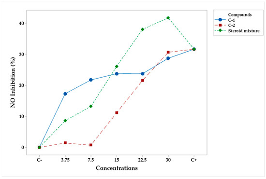Finally, in the case of compounds, both factors were statistically significant (p < 0.05) (Table 12). According to Tukey’s test, campesteryl palmitate and the steroid mixture exhibited greater NO inhibition than n-heptyl ferulate (Table 13 and Table 14). However, only the steroid mixture at concentrations of 22.5 and 30 μg/mL produced better results than C+ (Figure 7).