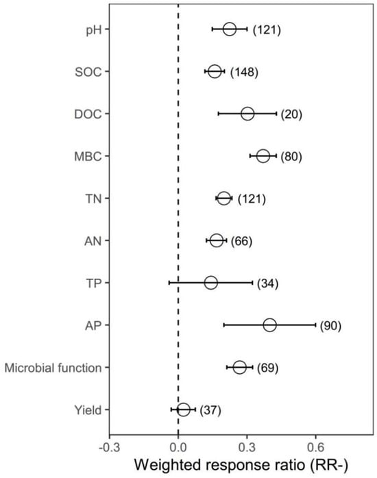 The effect of replacing chemical fertilizer with organic amendments on soil properties, microbial function and yield response ratio (natural logarithm-transformed ratio of organic amendments to chemical treatments, RR). The circles with error bars denote the overall mean response ratio and 95% CI, respectively. The numbers of observations are detailed beside each attribute in parentheses. pH, SOC, DOC, MBC, TN, AN, TP and AP represent soil pH value, organic carbon, dissolved organic carbon, microbial biomass carbon, total nitrogen, available nitrogen, total phosphorus and available phosphorus, respectively.