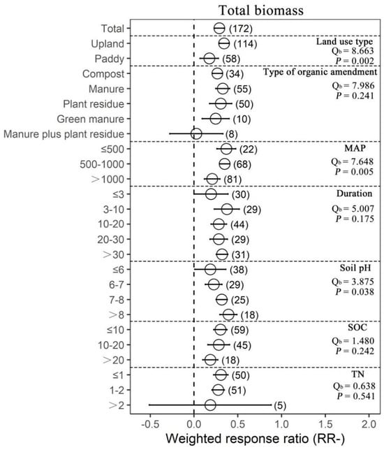 The effect of replacing chemical fertilizers with organic amendments on total biomass response ratio (natural logarithm-transformed ratio of organic amendments to chemical treatments, RR). The circles with error bars denote the overall mean response ratio and 95% CI, respectively. The numbers of observations are detailed beside each attribute in parentheses. The MAP, Duration, SOC and TN denote mean annual precipitation (mm), experimental duration (year), soil organic carbon (g/kg) and total nitrogen (g/kg), respectively. Qb denotes between-group heterogeneity in the same variable and there is significant difference between groups when p < 0.05.