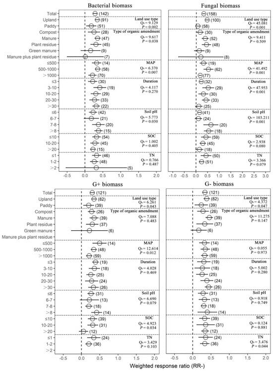 The effect of replacing chemical fertilizers with organic amendments on microbial biomass response ratio (natural logarithm-transformed ratio of organic amendments to chemical treatments, RR). The circles with error bars denote the overall mean response ratio and 95% CI, respectively. The numbers of observations are detailed beside each attribute in parentheses. The MAP, Duration, SOC and TN denote mean annual precipitation (mm), experimental duration (year), soil organic carbon (g/kg) and total nitrogen (g/kg), respectively. Qb denotes between-group variability in the same variable and there is a significant difference between groups when p < 0.05.