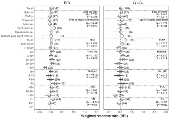 The effect of replacing chemical fertilizer with organic amendments on microbial community structure response ratio (natural logarithm-transformed ratio of organic amendments to chemical treatments, RR). The circles with error bars denote the overall mean response ratio and 95% CI, respectively. The numbers of observations are detailed beside each attribute in parentheses. The MAP, Duration, SOC and TN denote mean annual precipitation (mm), experimental duration (year), soil organic carbon (g/kg) and total nitrogen (g/kg), respectively. Qb denotes between-group variability in the same variable and there is a significant difference between groups when p < 0.05.