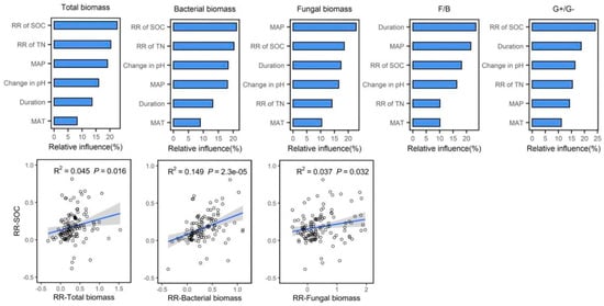 In order to explain the relative importance of soil characteristics, experimental duration and climate factors on soil microbial biomass, we selected the following six indicators for analysis: change in pH, response ratio (RR) of SOC, RR of TN, duration, MAP and MAT. The first four factors of each microbial biomass group could explain the variance in total biomass, bacterial biomass, fungal biomass, the fungi-to-bacteria ratio and the G+-to-G− ratio by 78.10%, 77.82%, 75.49%, 79.74% and 74.56%, respectively (Figure 5). RR of SOC was the predominant factor explaining the variation of total biomass, bacterial biomass and the G+-to-G− bacteria ratio, and MAP and the duration of the experiment were the predominant factors explaining the variation of fungal biomass and the fungi-to-bacteria ratio, respectively, accounting for approximately 22.61%, 21.11%, 24.09%, 22.89% and 24.08%. The correlation analysis indicated that the RR of total biomass (p < 0.05), RR of bacterial biomass (p < 0.01) and RR of fungal biomass (p < 0.05) were significantly increased with the increased RR of SOC (Figure 5).