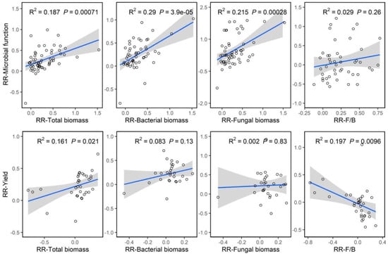 Our correlation analysis showed that the RR of microbial function was significantly and positively correlated with the RR of total biomass (R2 = 0.187, p < 0.01), RR of bacterial biomass (R2 = 0.290, p < 0.01) and RR of fungal biomass (R2 = 0.215, p < 0.01), respectively (Figure 6). Meanwhile, we found that the RR of yield significantly increased with the increasing RR of total biomass (R2 = 0.161, p < 0.05), but decreased with the increasing RR of the fungi-to-bacteria ratio. Overall, under the conditions of replacing chemical fertilizer with organic amendments, activities of soil microorganisms under organic amendments play an important role in improving microbial function and crop yields.