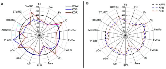 Spider plot of selected fluorescence parameters characterising the changes in PSII of green (A) and red (B) kale microgreens cultivated under different spectral compositions of light. All values are shown as per cent of the control (W light) (W light = 100). The parameters are divided into the following groups: energy fluxes, quantum yields and efficiencies, specific energy fluxes (calculated per single RC), and generalised parameters of PSII functional activity, i.e., performance indexes. (KGW—green kale under white light, KGB—green kale under white + blue light, KGR—green kale under white + red light, the same for KR—red kale). The presented data are mean values based on 20 replicates.