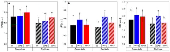 Changes in the non-photochemical fluorescence quenching (NPQ): (A) photochemical quenching in the relative reduction state of QA reflecting the fraction of open PSII reaction centres (qP) (B) and vitality index of PSII indicative of interactions between the light-stage reactions activated by PAR absorption and the dark reactions of photosynthesis (Rfd) (C) in green and red kale microgreens cultivated under different spectral compositions of light. Columns with different letters are statistically different for different lights and types of kale (p < 0.05). Mean values from two cycles represent the average of six plants per replication (experimental unit) and four replications per treatment in each cycle.