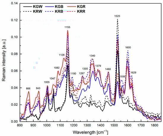 Raman spectra for microgreens grown in different spectral compositions of light together with the marked positions of the peaks characteristic of the relevant functional groups (carotenoids, polysaccharides, chlorophyll, lipids, carbohydrates, flavonoids, and proteins). (KGW—green kale under white light, KGB—green kale under white + blue light, KGR—green kale under white + red light, the same for KR—red kale). The spectra are means from 5 independent measurements.
