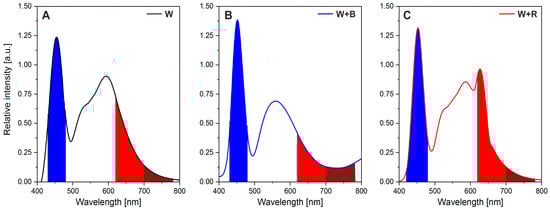 The spectral composition of light-emitting diodes (LED) used during microgreens growth with areas of blue (430–480 nm), red (620–700 nm), and far-red (700–780 nm) light highlighted. (A) One hundred per cent of white light, (B) white light enhanced in the blue light range, and (C) white light enhanced in the red light range.