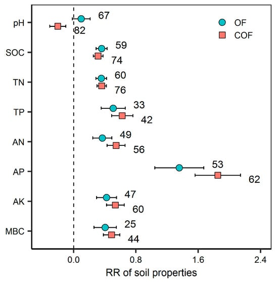 Effect of organic and chemical–organic fertilization on soil properties. Values are mean 95% confidence intervals of the percentage effects between the treatment and control. The numbers at the right side of the confidence intervals represent the sample sizes. SOC, TN, TP, AN, AP, AK and MBC represent soil organic carbon, total nitrogen, total phosphorus, available nitrogen, available phosphorus, available potassium and microbial biomass carbon, respectively. OF and COF represent organic fertilizer and chemical–organic fertilizer, respectively.