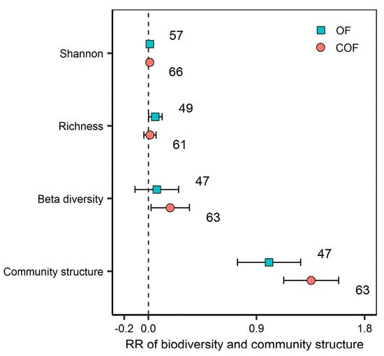 Microbial diversity is a significant determinant of ecosystem health, as soil microorganisms play essential roles in maintaining ecosystem stability and productivity [30,31]. Despite the importance of bacterial diversity for soil fertility and plant growth, the long-term effects of organic and chemical–organic fertilization on bacterial diversity remain unclear, e.g., positive effects [23,32] or no/negative effects [19,33]. Our meta-analysis demonstrates that, compared to the no-fertilization control, OF and COF significantly altered bacterial community structure but had a negligible positive effect on the bacterial Shannon and Richness indices. Additionally, only COF showed a significant increase in increase bacterial beta diversity. These results imply that OF or COF had the potential to maintain soil bacterial diversity in agroecosystems.