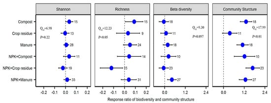 Effect of organic and chemical–organic fertilization on bacterial diversity and community structure. Values are mean ± 95% confidence intervals of the percentage effects between the treatment and control. The numbers at the right side of the confidence intervals represent the sample sizes.