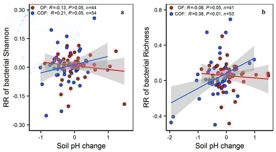 Coordinated changes between soil pH and bacterial diversity. (a) Relationship between changes in soil pH and response ratio of bacterial Shannon. (b) Relationship between changes in soil pH and response ratio of bacterial Richness.