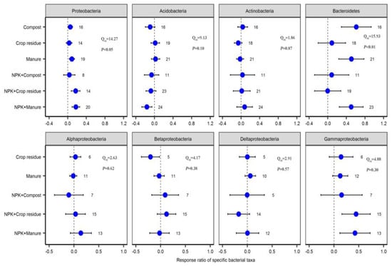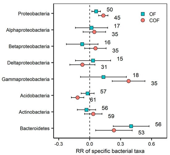 Effect of organic and chemical–organic fertilization on specific bacterial phyla. Values are mean ± 95% confidence intervals of the percentage effects between the treatment and control. The numbers at the right side of the confidence intervals represent the sample sizes.