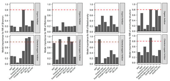 Model-averaged importance of the predictors of organic and chemical–organic fertilization impact on soil bacterial community. The importance is based on the sum of Akaike weights derived from the model selection using Akaike’s Information Criteria corrected for small samples. The red dotted line was a cutoff of 0.8. A cutoff of 0.8 is set to differentiate between important and non-essential predictors. Abs represents absolute value.