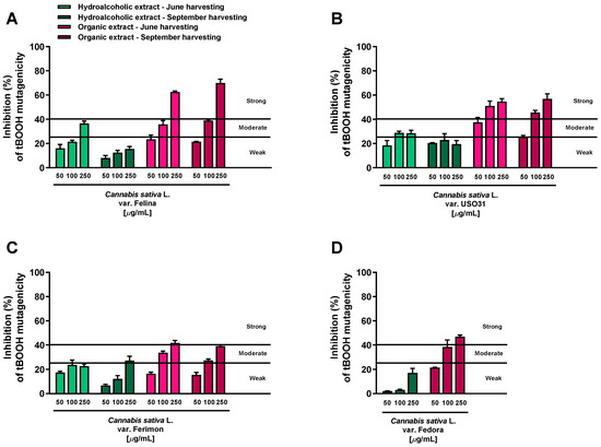 Among the hydroalcoholic samples, the extracts from the June-harvested inflorescences of Felina and USO31 varieties were the most effective. At the highest concentration tested (250 μg/mL), their antimutagenicity was 36.5% and 31.5%, respectively (Figure 1A,B); in all the other cases, a maximum inhibition from 15.6% to 27% was reached (Figure 1A–D). Conversely, strong antimutagenic effects were obtained when the WP2uvrAR strain was treated with the organic extracts of all varieties at both harvesting periods: the maximum inhibitions of about 62.5% and 70% were reached at the highest concentrations of the Felina samples from June and September harvesting, respectively (Figure 1A). Similarly, the extracts from the USO31 inflorescences collected in June and September produced the maximum inhibitions of 55% and 57% (Figure 1B). A lower but always strong antimutagenic effect was obtained using the organic samples of Ferimon (maximum inhibition of about 40%) and Fedora (up to 47% inhibition) (Figure 1C,D).