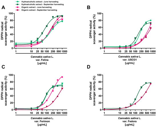 Scavenger activity of the hemp extracts obtained from the Monoecious Cultivars inflorescences collected in June and September against the DPPH radical. (A) C. sativa var. Felina 32; (B) C. sativa var. USO31; (C) C. sativa var. Ferimon; (D) C. sativa var. Fedora. The values represent the mean ± SEM (n = 6).