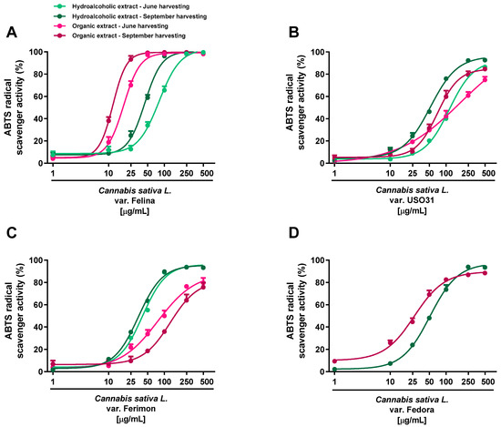 Scavenger activity of hemp extracts obtained from the Monoecious Cultivars inflorescences collected in June and September against the ABTS radical. (A) C. sativa var. Felina 32; (B) C. sativa var. USO31; (C) C. sativa var. Ferimon; (D) C. sativa var. Fedora. The values represent the mean ± SEM (n = 6).